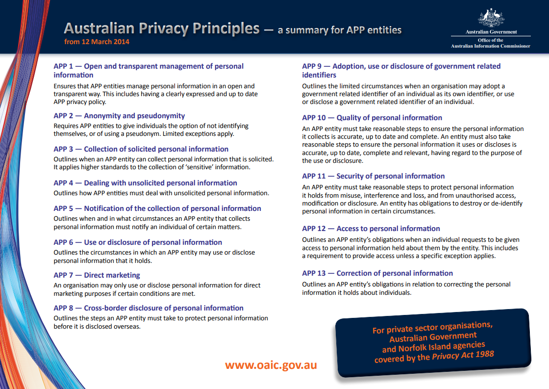 Outlined in the Privacy Act 1988, the following are guidelines defined to handle data.