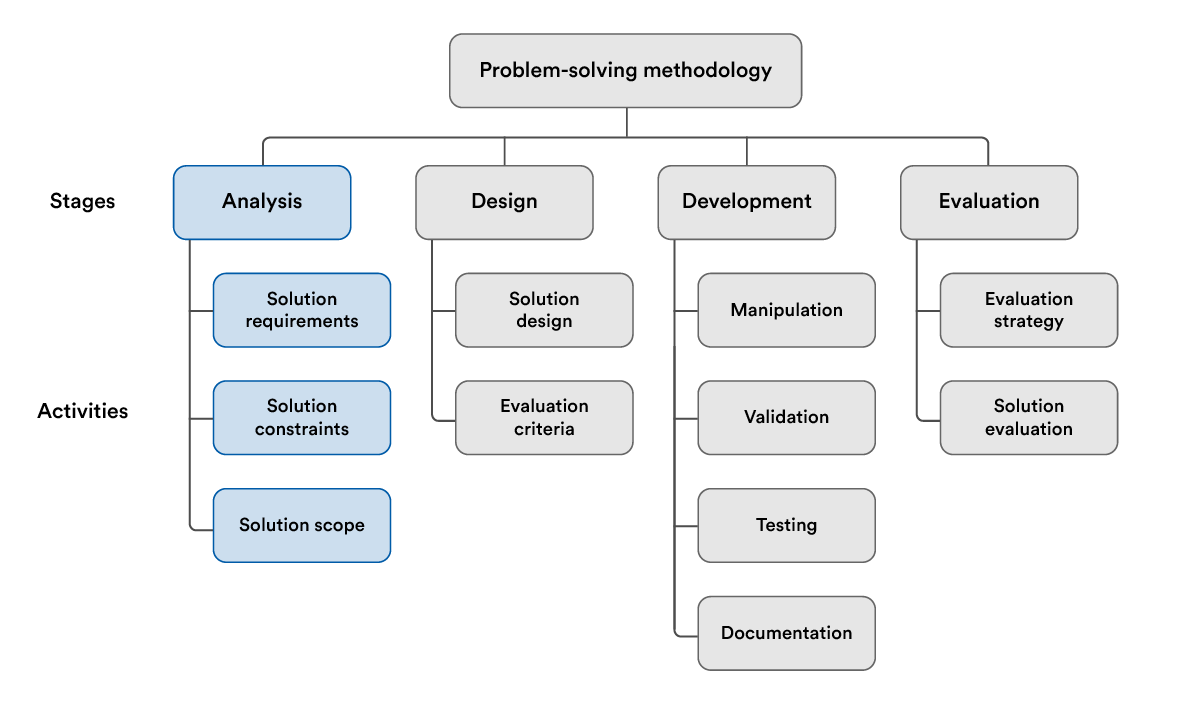 The analysis stage refers to determining the requirements that solve a need or opportunity. This stage involves 3 activities: